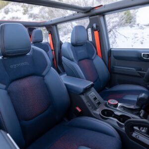 Owners can opt for upgraded features such as all-new laser-perforated Black Onyx Neo suede seats, vinyl-wrapped instrument panel topper, leather-wrapped outer seat bolsters and carpet flooring. A thicker and sport-contoured steering wheel with magnesium paddle shifters and gloss black Raptor logo center continues the Ford Performance treatment. Ford Performance-designed front seats are unique to Bronco Raptor, designed with aggressive foam side bolsters to help keep passengers firmly seated when the terrain gets nasty. Available Code Orange seat belts provide even more Ford Performance style.