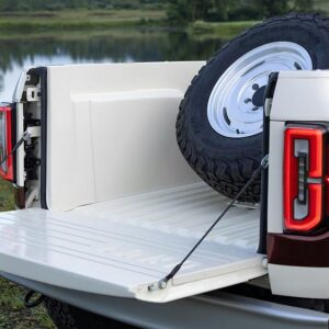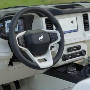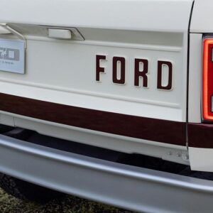 - Classic exterior details – machined Fifteen52 Analog wheels, a fold-down tailgate with “FORD” stamped into the metal, and modified bumpers to echo the OG Bronco’s design.