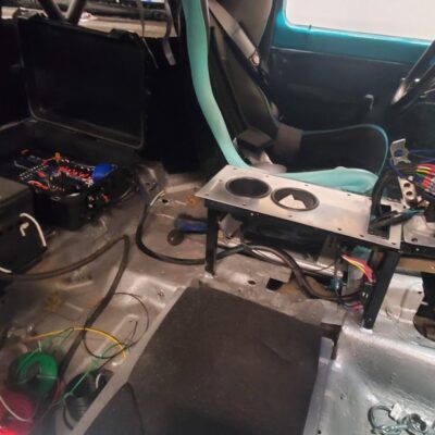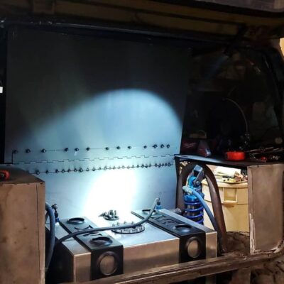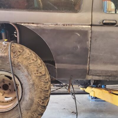 With the rear suspension being stretched 8-inches rearwards, an old Ford Ranger bed was used to make the panels to fill the wide space between the rear tires and the doors.