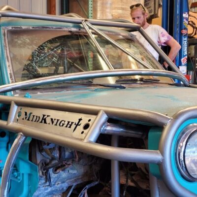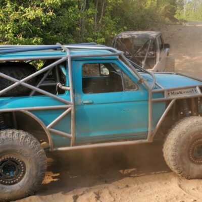Dugan of MidKnight Fabrications had a modified Ford Ranger, but the body was trashed from a few rollovers and tree encounters. He found an old Bronco II and decided to transfer all of the good parts from the Ranger to the Bronco II.