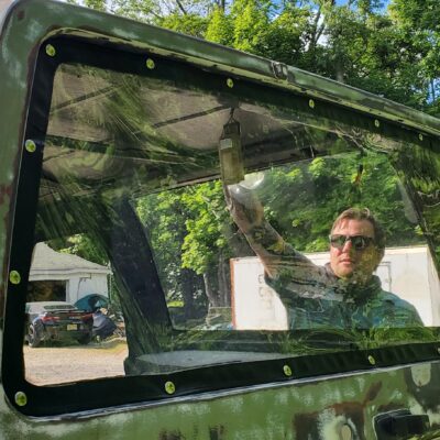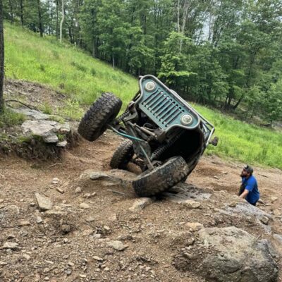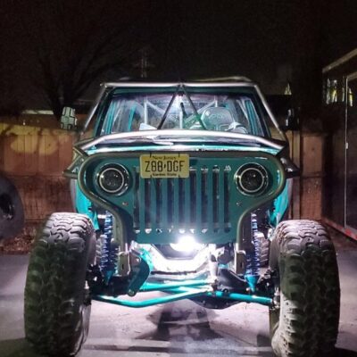 Here’s something you’ve probably never seen before. It looks like some kind of Willys coming towards you, but it’s a little confusing because you’re counting the grill slots, but there aren’t any turn signals under the headlights, or the holes to mount them in. Looking closer it appears to have a Ford TTB front suspension. Is that a Dana 44 TTB? Those look like 39-inch IROKS that you would find on a rock crawler. Why doesn’t this thing have a Dana 60 solid front axle?