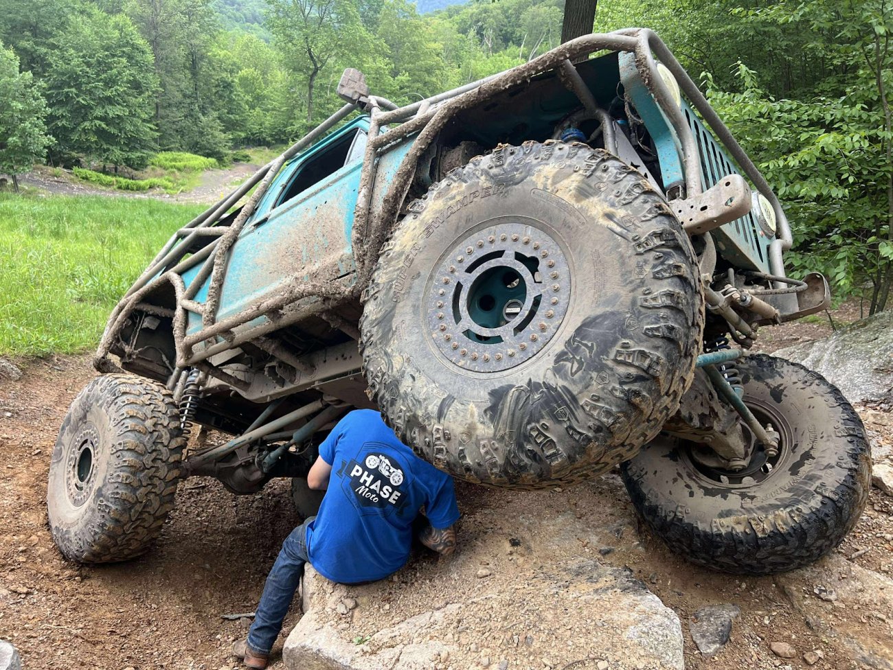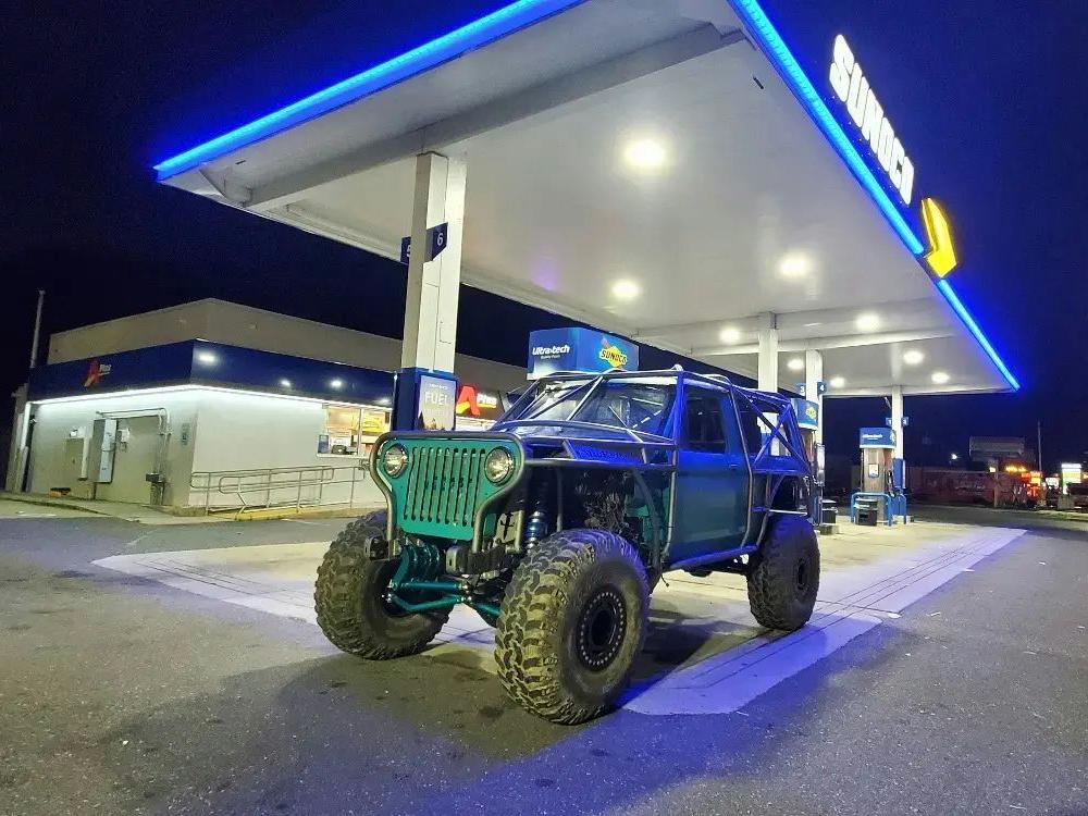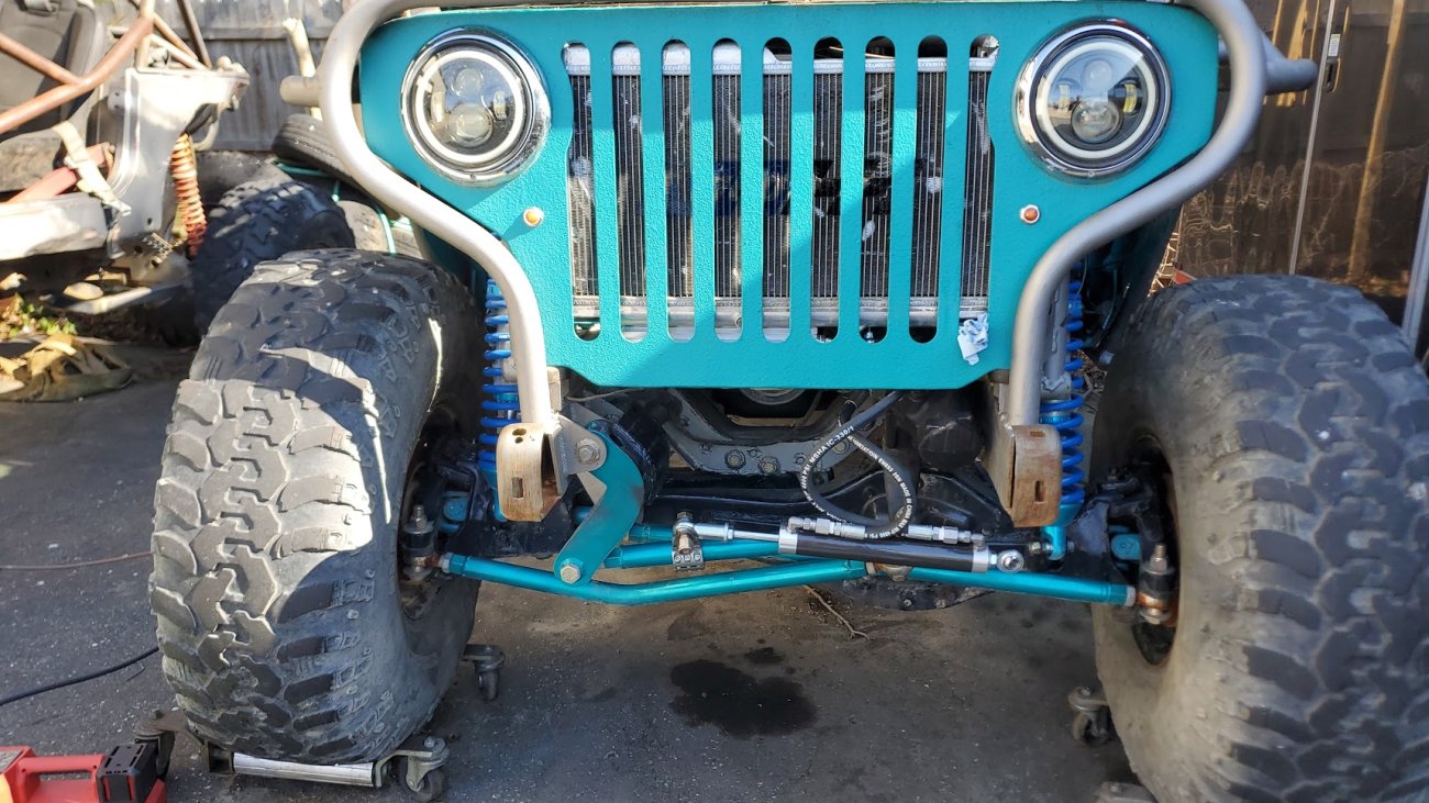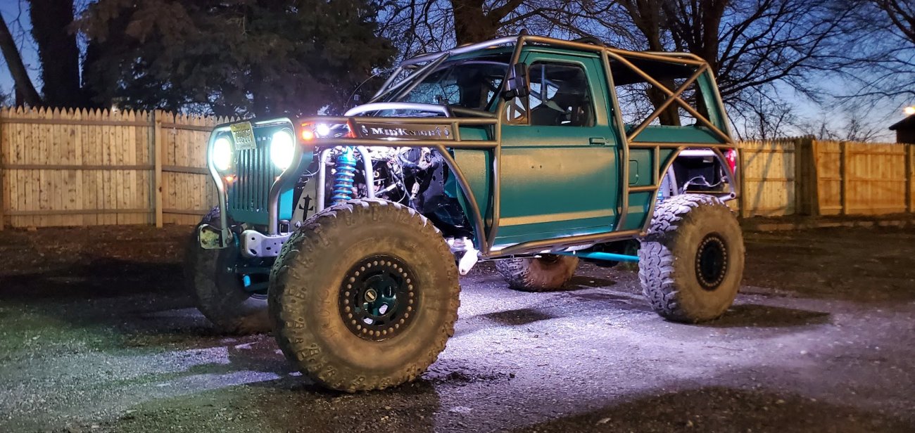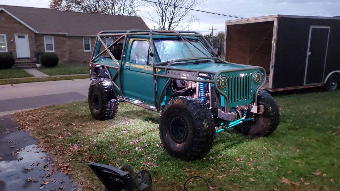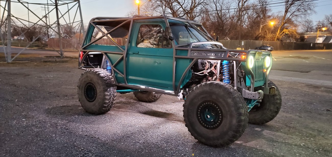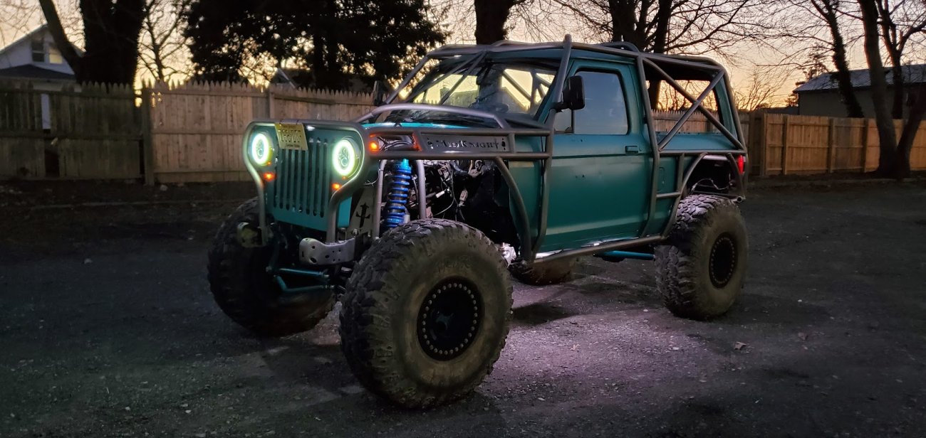 Here’s something you’ve probably never seen before. It looks like some kind of Willys coming towards you, but it’s a little confusing because you’re counting the grill slots, but there aren’t any turn signals under the headlights, or the holes to mount them in. Looking closer it appears to have a Ford TTB front suspension. Is that a Dana 44 TTB? Those look like 39-inch IROKS that you would find on a rock crawler. Why doesn’t this thing have a Dana 60 solid front axle?