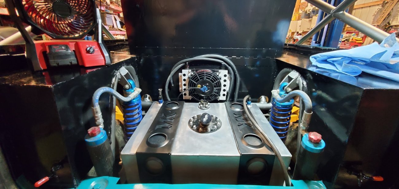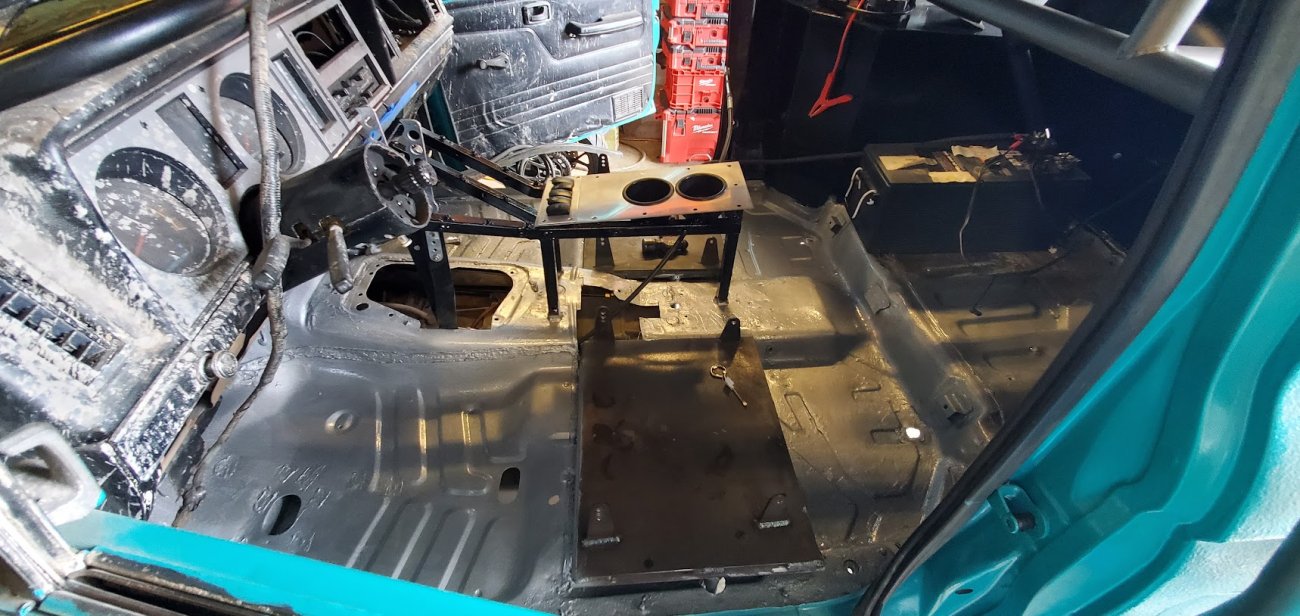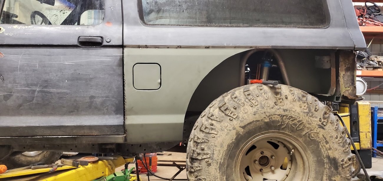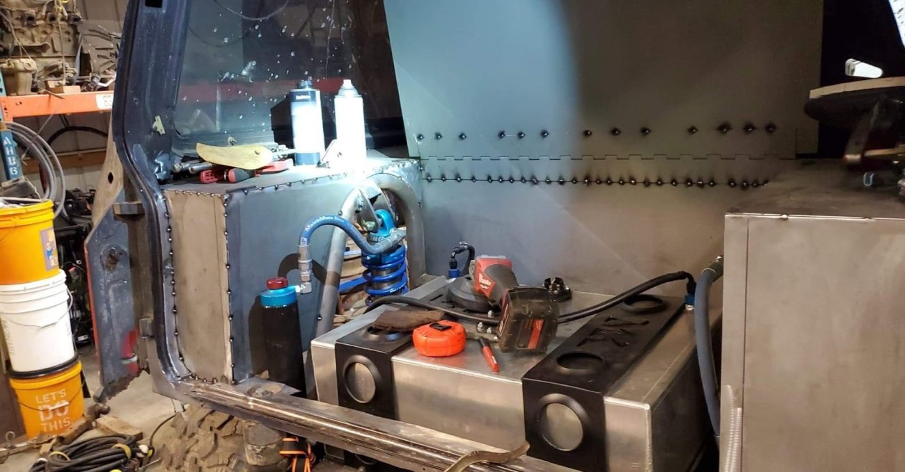 With the rear suspension being stretched 8-inches rearwards, an old Ford Ranger bed was used to make the panels to fill the wide space between the rear tires and the doors.