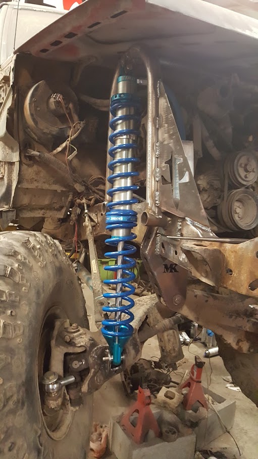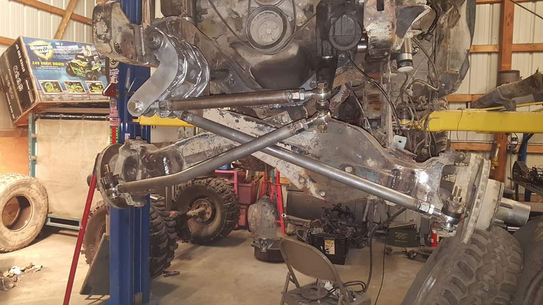 And the lower ball joint mounts were cut, moved outward a 1/2-inch, and welded in position to correct the alignment. The front axle is outfitted with 4.56 gears and a Lockrite locker. The front suspension uses longer radius arms, King 2.5-inch 14-inch coilovers, Fox bumpstops, and was pushed forward 6.5-inches. A drilled and tapped steering box, F350 power steering pump and hydro assist with a remote cooler help steer the 30-inch IROK tires.