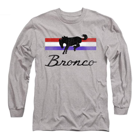 - Ford Bronco unisex adult 100% cotton long-sleeve T shirt. In addition to being 5.3 oz with an 18/1 thread count, all our shirts are pre-shrunk with a double needle collar, sleeve, and hem made for both men and women.