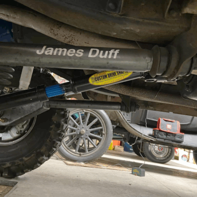 The Bronco received a James Duff suspension lift that included a dual front shock setup and extended radius arms. The lift makes room for the 34×9.5-15 Interco Super Swampers. I like that they’re mounted on white steel wheels to retain the period correct vibe of the vehicle. A Tom Woods driveshaft gets the power from the transfercase to the wheels.